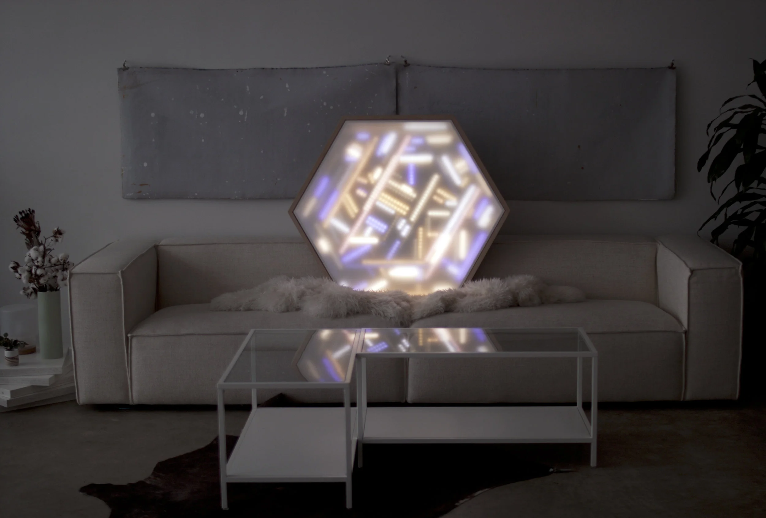 UVA is inspired by the idea of an artificial machine star, wired by hand and produced using only LED lights sold as some variation of white. (Cool, natural, neutral, and warm white) As it runs, UVA produces a shifting menagerie of color gradients which pulse and blend, combining rigid geometric patterns with a soft atmospheric glow.